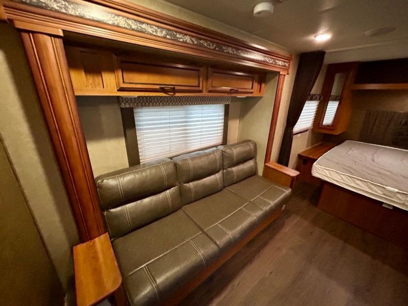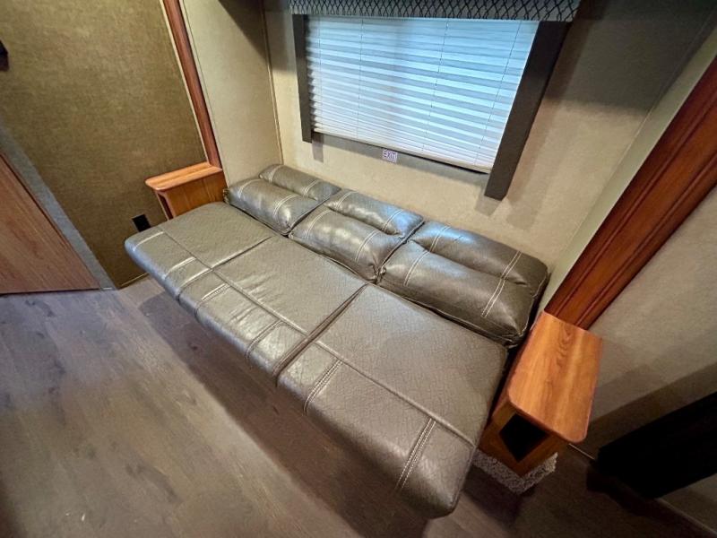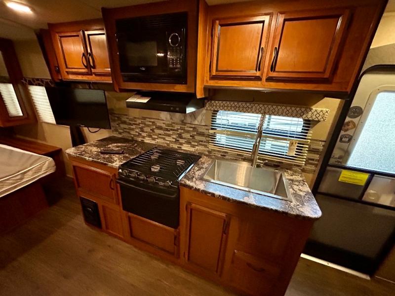 As you enter you will notice that the single slide creates a bit more space inside when fully expanded. There is a pantry to the immediate left of the door with a refrigerator beside it. The double kitchen sink is to your right along with a three burner range and microwave oven. Cooking up light meals and snacks is easy in this Launch Ultra Lite kitchen with counter space and overhead cabinets for storage.
