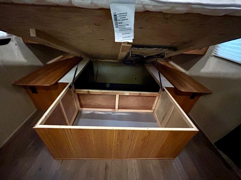 The sofa slide features an 24" x 40" dinette table that is convenient for dining, and there is also an overhead storage cabinet for your things.