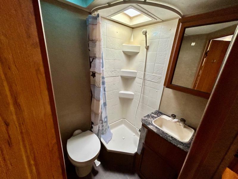 In front relax and enjoy a great nights sleep on the queen bed provided with an overhead storage shelf. There are wardrobes on either side for clothing, plus so much more!