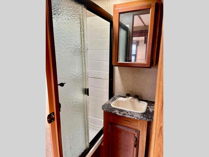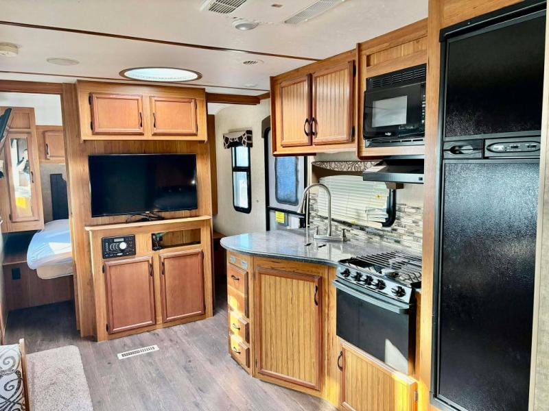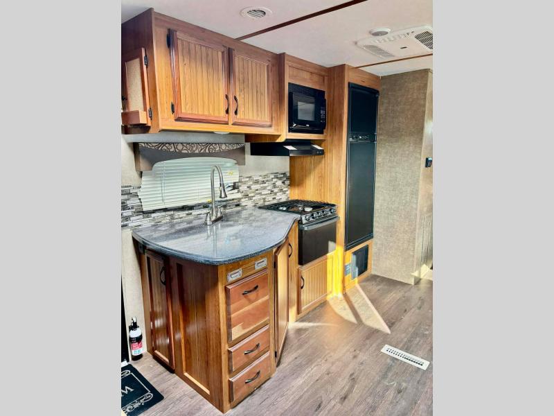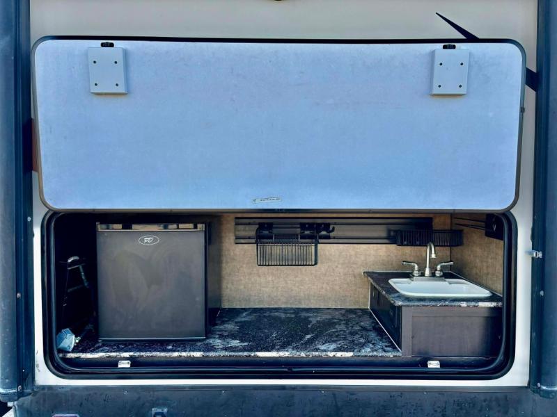 On the outside enjoy a rear kitchen with bumper mount grill, a 6 foot awning covering it, a refrigerator, sink, and so much more!