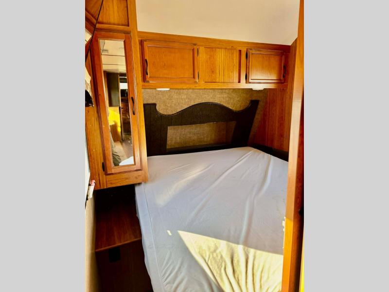 There is a front queen bed with wardrobes for storage on either side of the bed, and an overhead cabinet too. There are dual pocket doors that can be closed for more privacy at night on both sides of the entertainment center.