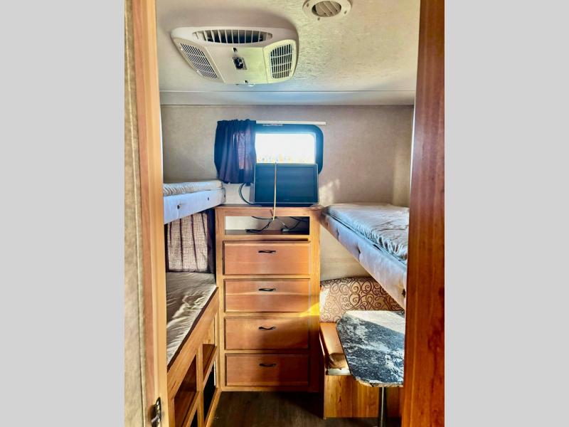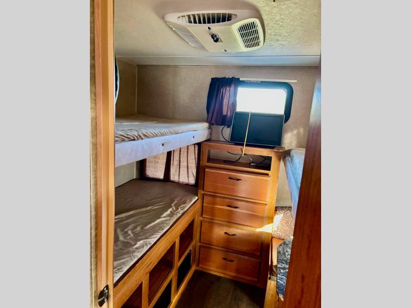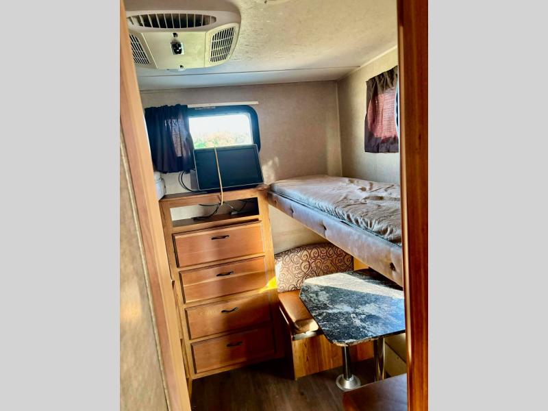 The rear bunkhouse features a dinette with bunk above on the left, and a set of bunk beds on the right. There is also a dresser with TV stand between the two.