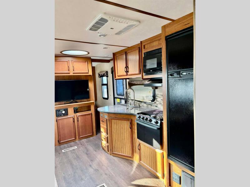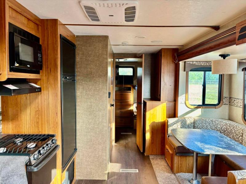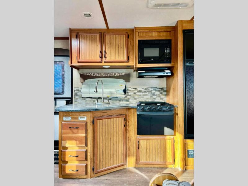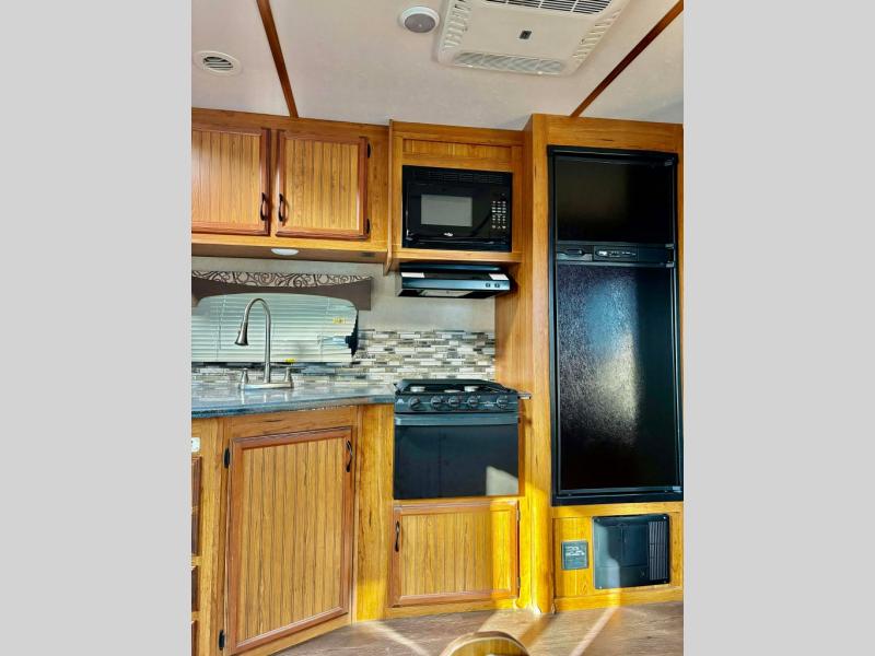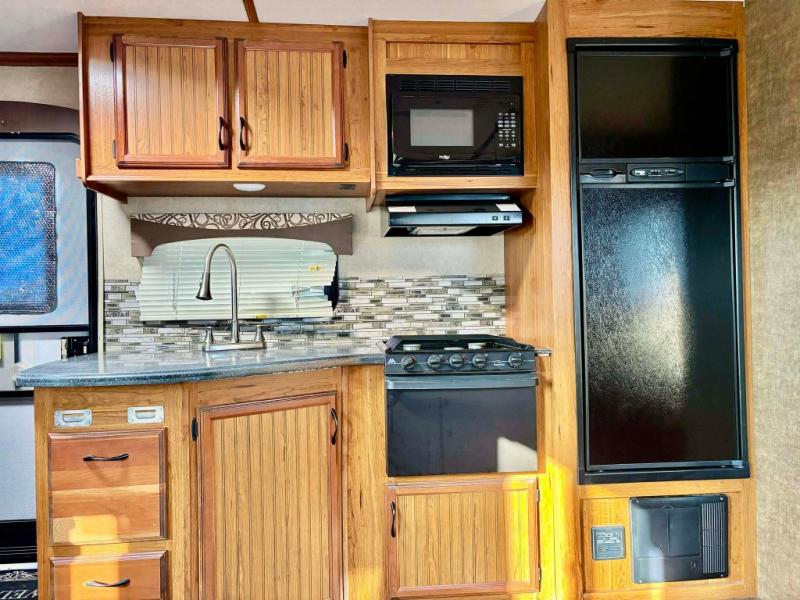 Across from the slide is the kitchen which features a refrigerator, three burner range with microwave oven, and large kitchen sink, plus counter extension. There is also a pantry off to the side of the u-shaped dinette for dry goods storage and more.