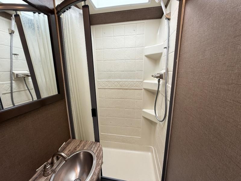 A sliding door provides privacy to the rear bath area, while a privacy curtain closes off the bedroom area. There is a closet along the curb side and a king bed along the road side. The king bed slides out and also features overhead storage and nightstands on either side of the bed. A 32" LED TV is on the opposite wall as the bed for easy viewing. You will find a privacy curtain that can be pulled around the bed area leaving the bathroom open to the other front sleeping travelers at night. The complete bath provides a toilet with overhead storage, sink, and a 24" x 36" shower.