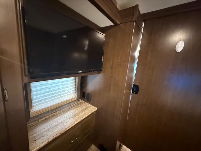 The rear bedroom features a queen bed with nightstands and overhead cabinets. There is also a closet and dresser along the full wall slide. Above the dresser there is a 32" LED TV for your enjoyment.