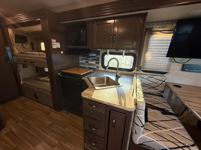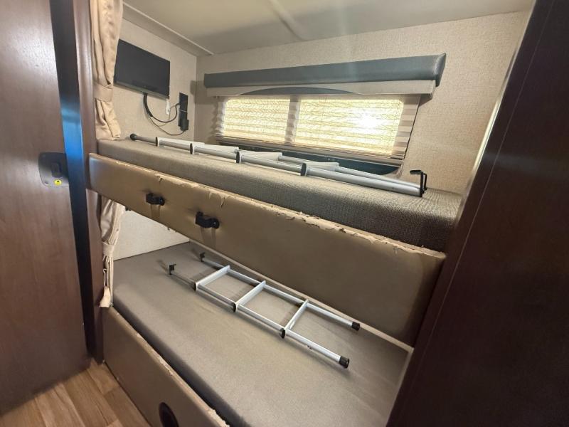Back up front you will find a drop-down overhead bunk for added sleeping space when needed, plus so much more! And outside there is a 32" LED TV for watching your favorite shows and movies in the great outdoors.