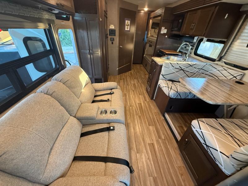 Step inside and find a jack-knife sofa to the right of the entrance. Across from the sofa is a booth dinette for mealtime and more. There is a 40" LED TV above the dinette that can easily be viewed from the sofa opposite. A convenient coffee table is between the driver and passenger seats for additional table space.
