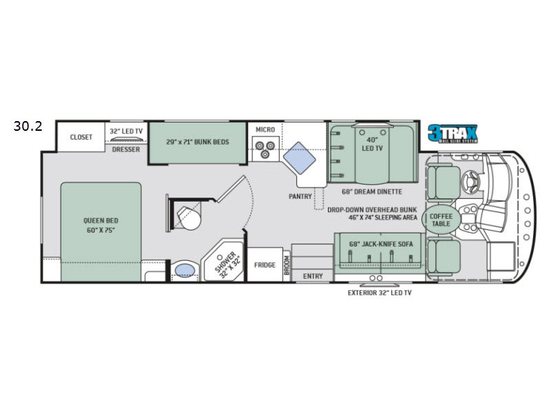 | TV Info | Living Room 40" LED TV, Bedroom 32" LED TV, Bunk Area (2) 13" LED TV's, Exterior 32" LED TV |