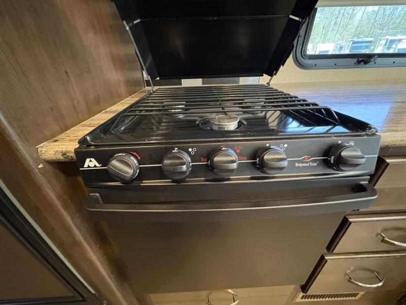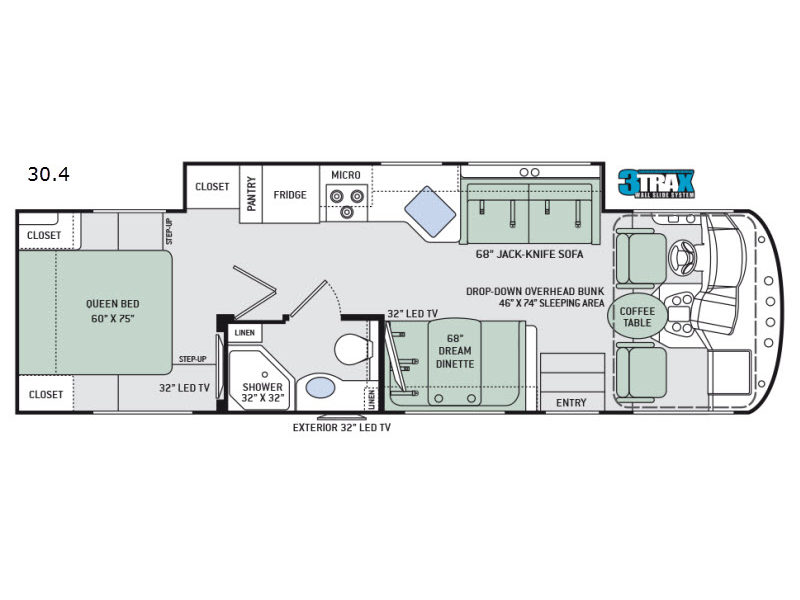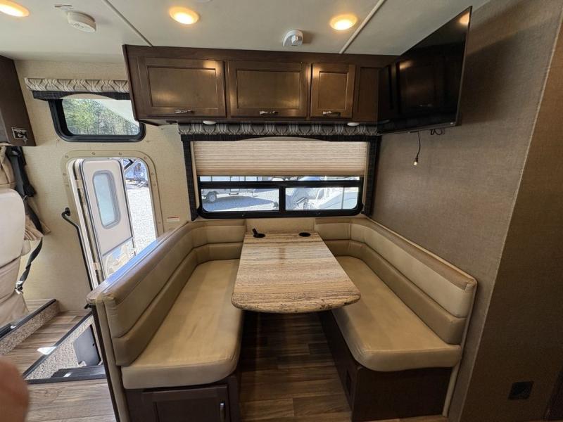 Opposite the sofa you will find a booth dinette with a 32" LED TV overhead. The dinette features two sets of seat belts, with two more on the jack-knife sofa so your backseat travelers can be safe while moving down the road.