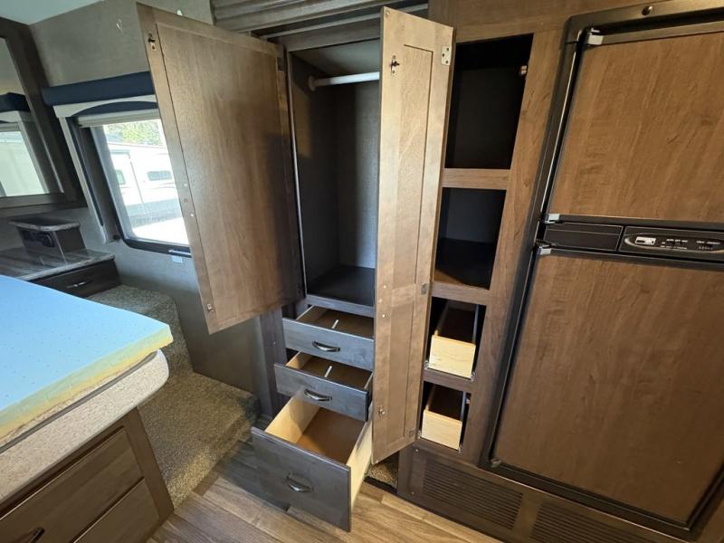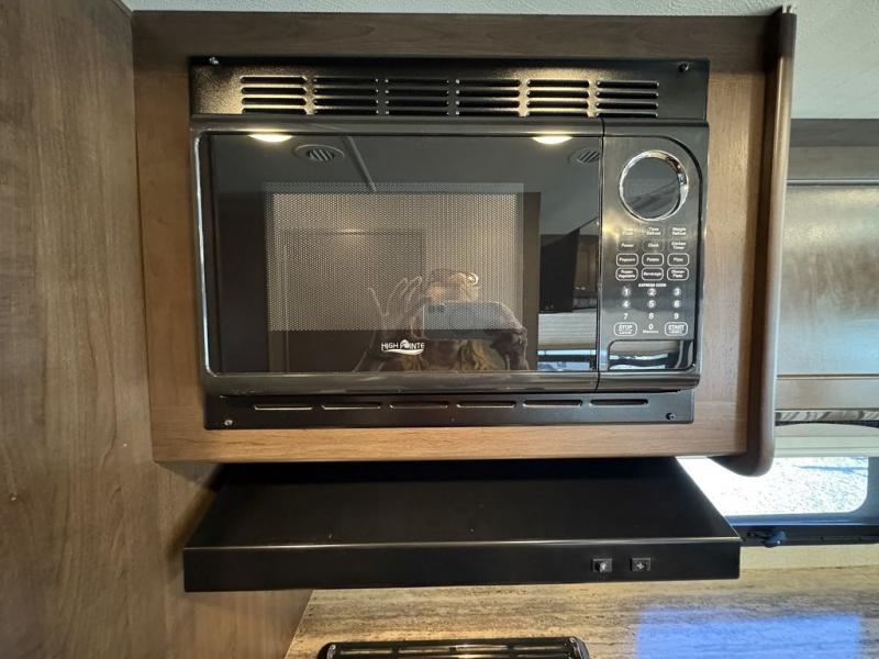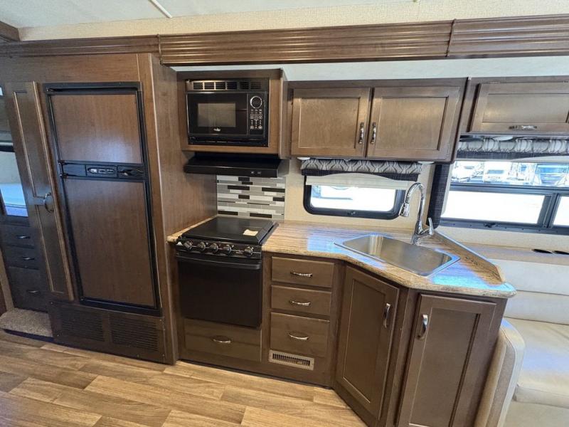 Step inside behind the front passenger seat and notice the spacious interior with a large driver's side slide fully extended. Within the slide out there is a jack-knife sofa, a large sink, counter space, a three burner range with overhead microwave oven, and a pantry, plus a closet in the bedroom.