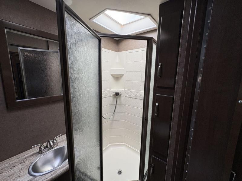 A convenient bathroom between the main living area and the bedroom includes a corner shower, vanity with sink, linen storage, and a toilet. There is also an overhead cabinet along one side for storing towels and toiletries.