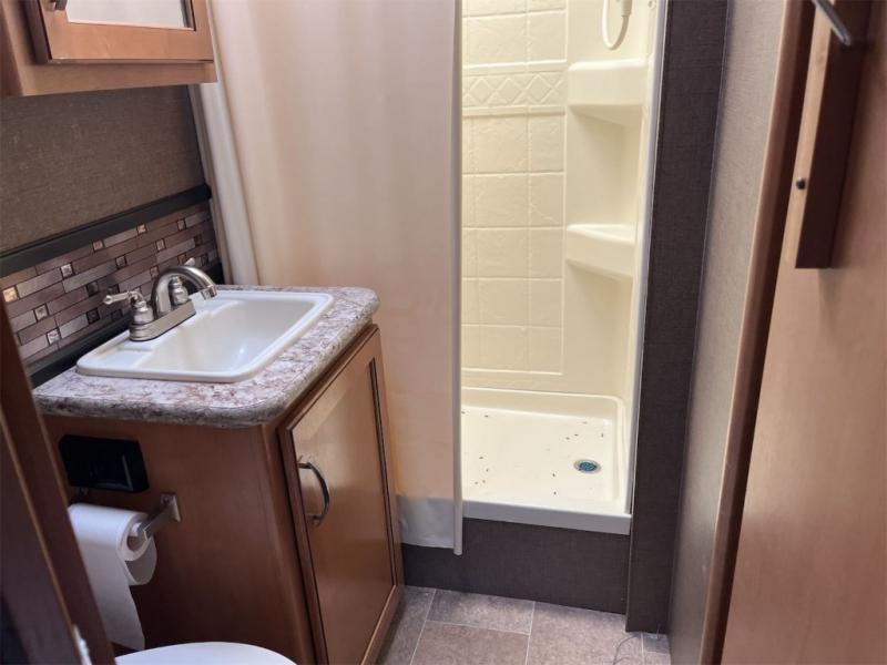 In the rear where you step up beyond the pantry and refrigerator find a left corner bath with 24" x 36" shower, sink, and toilet, plus overhead storage. The opposite side is where you can catch a wink or two and be rested for another day of fun. You will find here a queen bed slide out with storage above, a privacy curtain, a closet for your clothing, and an optional 32" LED TV, plus so much more!