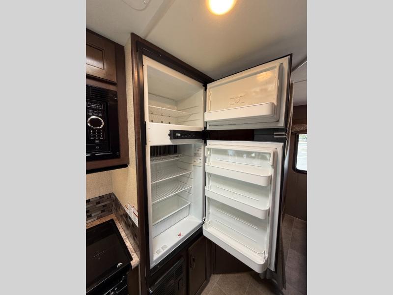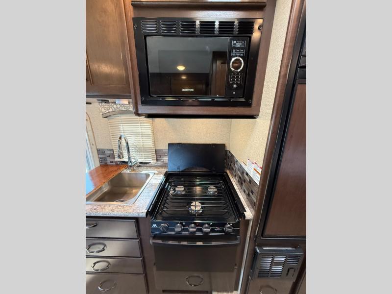 The door side features a kitchen area with double sink plus flip-up counter top, a three burner range with overhead microwave oven, and the refrigerator which is located along the same side but a step up from the entry level floor. There is also a pantry opposite for all of your canned and dry food storage needs. You will also find ample overhead cabinets for dishes and things up front.