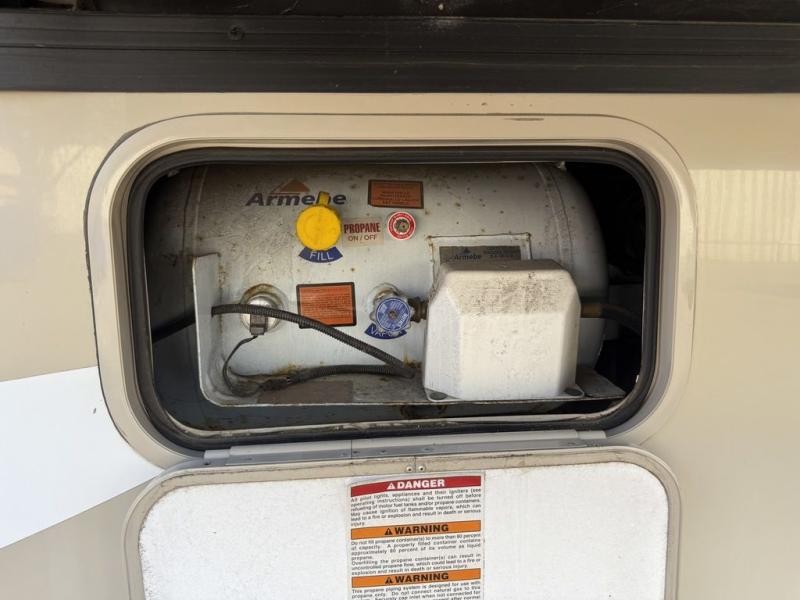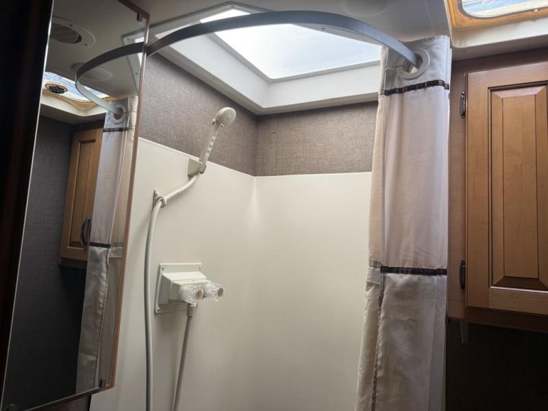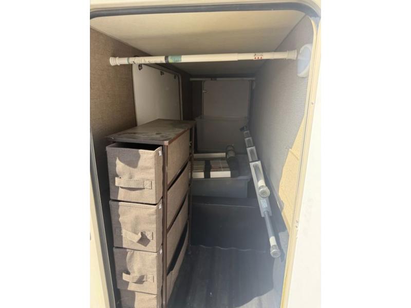Continue on toward the rear and find a bathroom along the road side that provides a 27" x 27" shower, toilet, and small sink. Opposite the bathroom next to the refrigerator is a closet for your clothing and/or linens.