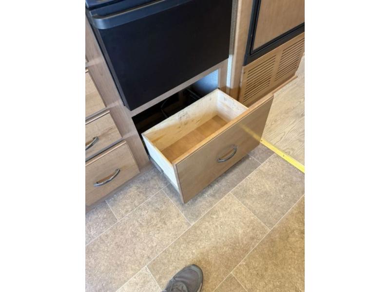 To the left of the entry door enjoy cooking up your camp favorites using the three burner range and overhead microwave oven. There is a refrigerator, a double sink, and a flip-up counter-top to provide even more space for food prep, and ample storage in overhead cabinets, plus drawer space too.
