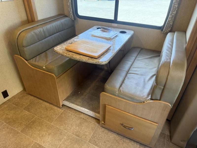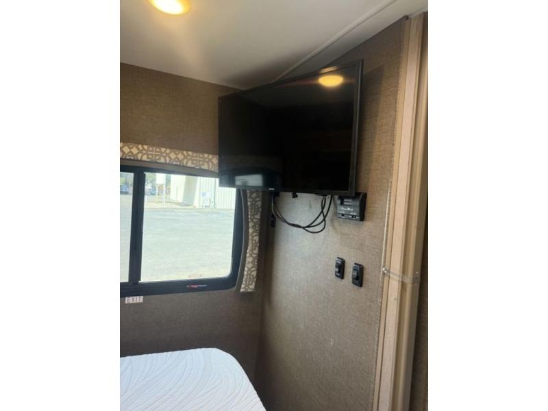 Step inside model 24HL and notice the slide out Dream Dinette straight ahead. There is a 32" LED TV above the door opposite the dinette for perfect viewing. You will find two sets of seat belts for rear travelers here, and overhead storage for your things. At night if you need the extra sleeping space you can easily convert the dinette for one adult or two children with a 42" x 68" sleeping area. There is storage beneath both bench seats where you can easily keep blankets and pillows tucked away. There is also a cab-over bunk that features a 52" x 87" sleeping area as well.