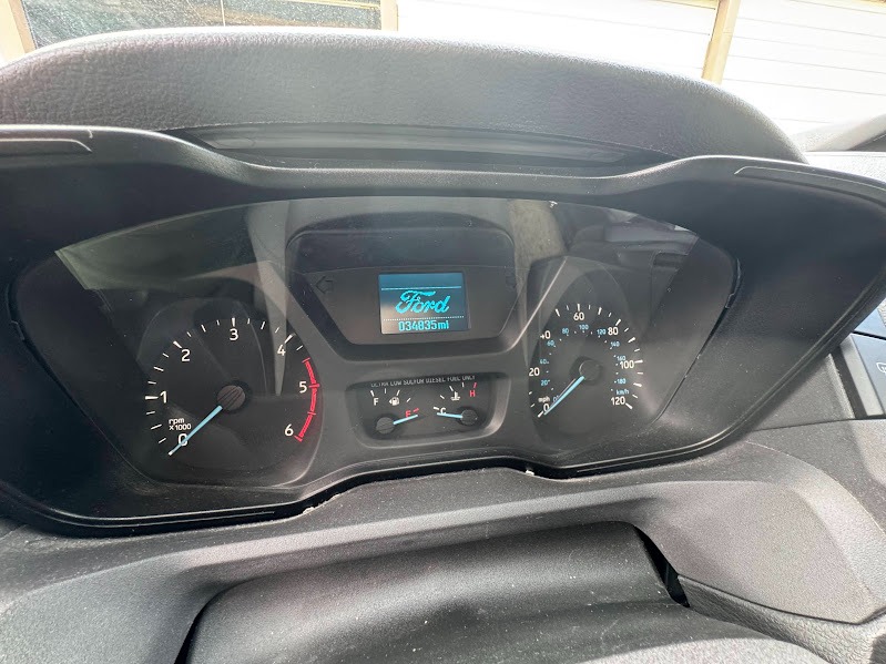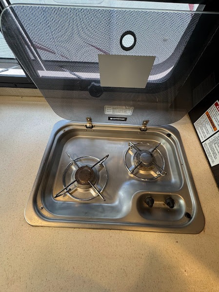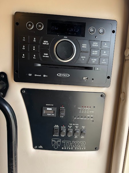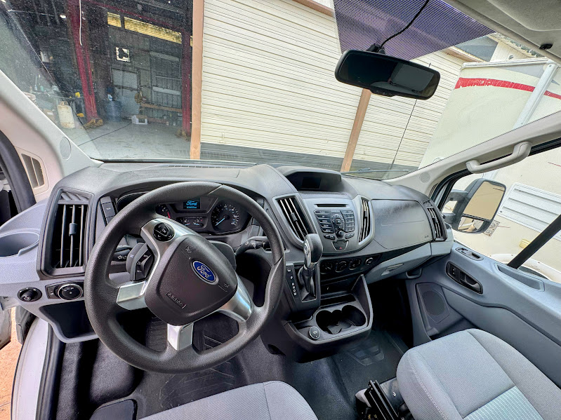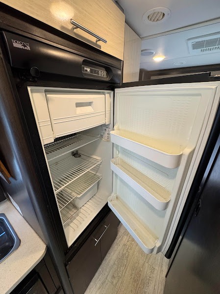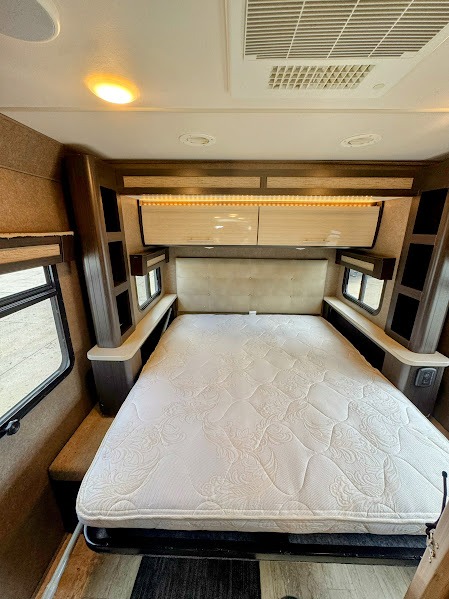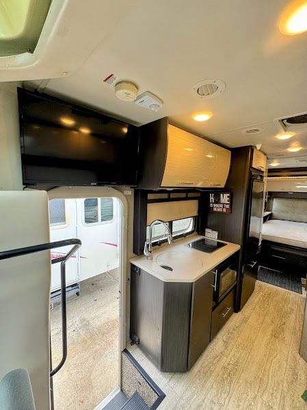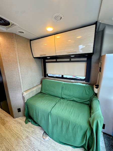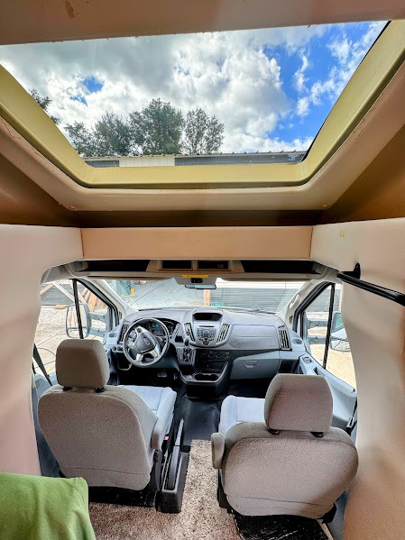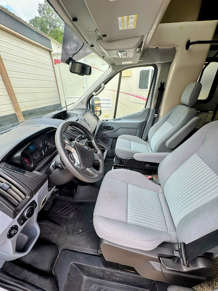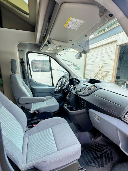 Enter in front behind the passenger's seat and notice a 32" LED TV overhead. This can easily be viewed from the sofa opposite. There are two sets of seat belts for your rear travelers, and the sofa can easily be turned into sleeping space for on board campers or overnight guests. A removable pedestal table creates a nice dining space up front. Plus there is a built-in skylight over the cab area providing more natural light inside.