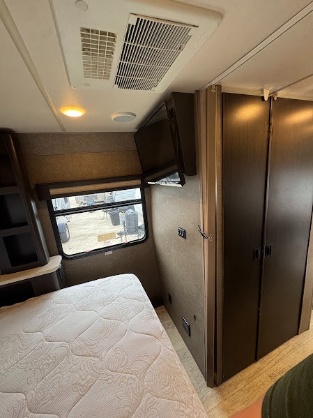 A rear flip up queen size bed slides out to provide a bit more space inside with cushioned seating underneath. There is also a table base, and a 32" LED TV. A pleated door can be pulled to give you more privacy in the bedroom area at night, plus so much more!