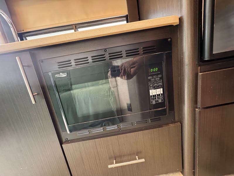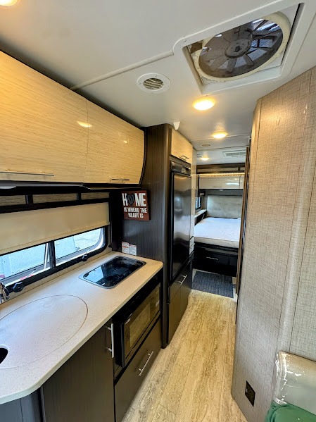 To the left of the entrance enjoy cooking and preparing light meals and snacks with a two burner cook-top, convection microwave oven, overhead cabinets, refrigerator, and round kitchen sink. There are ample overhead cabinets for stowing away your dishes and things.