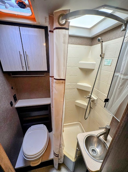 The bathroom features an angled 27" x 27" shower, toilet, and sink with overhead storage. There is also a linen cabinet opposite for your towels and toiletries.