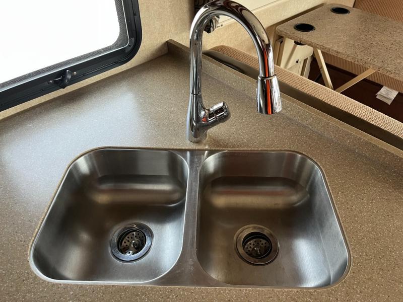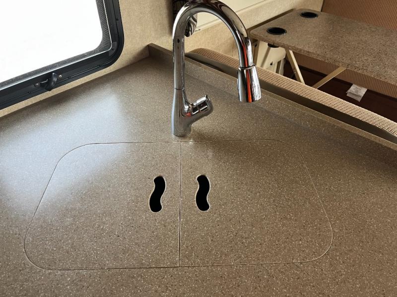 Step inside and you’ll find a bright and inviting interior enhanced by a large slide-out that expands the living space and creates room for comfortable seating and dining. The fully equipped kitchen includes modern appliances and generous storage, making meal preparation simple whether you're cooking breakfast before a hike or dinner after a long day on the road. Toward the rear, the private bedroom offers a peaceful retreat with plenty of wardrobe space, while the cab-over bunk and convertible living areas provide additional sleeping options for family or guests.