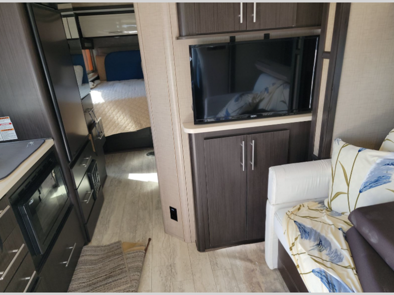 There are plenty of overhead cabinets throughout, seat belts for two on the sofa, plus an optional exterior 32" LED TV, and so much more!