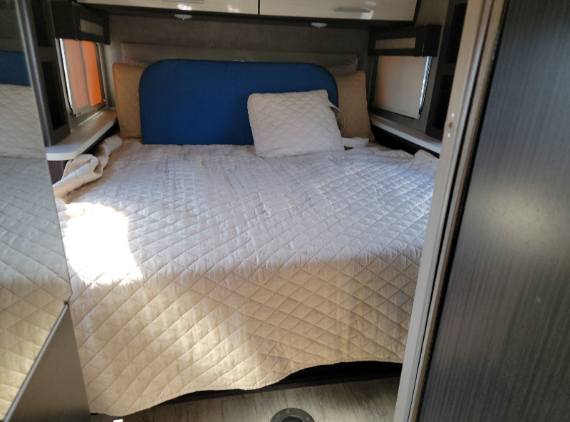 Head to the rear of the motorhome to a side bath including a toilet, corner shower, sink, and overhead storage for your toiletries and towels. A closet is just outside the double doors for your clothes and things.