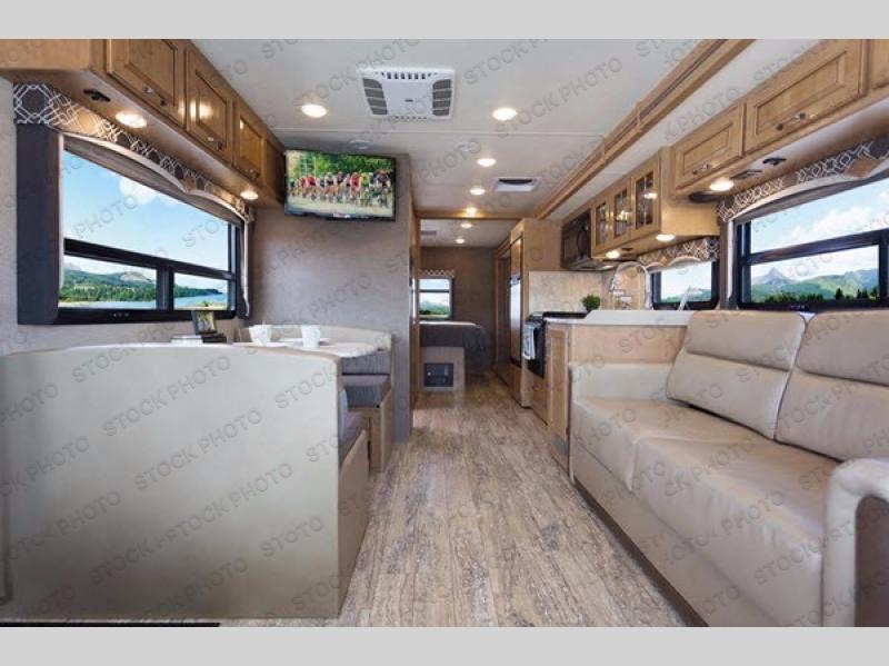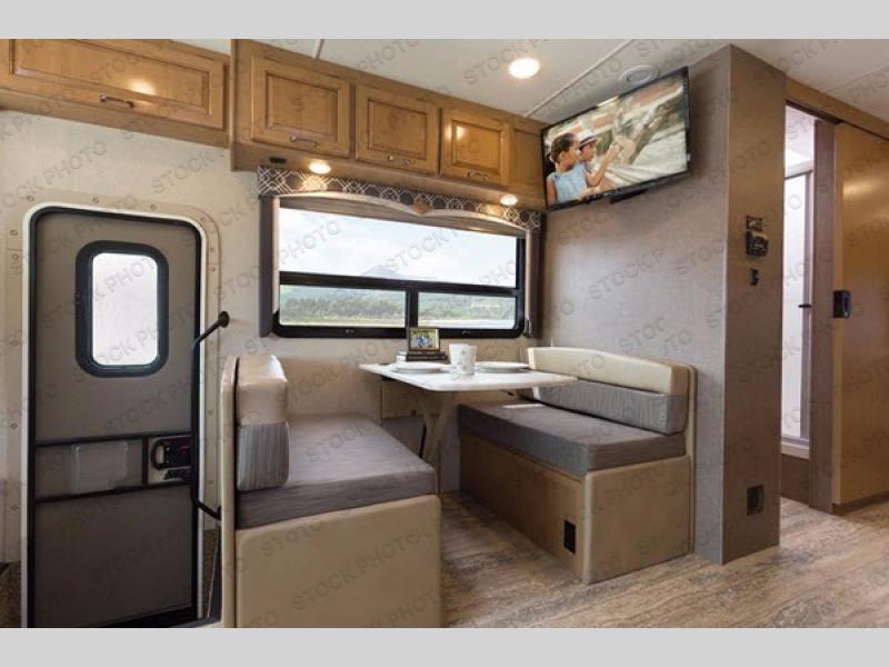 Along the curb side, a dream dinette provides space for meal time and additional sleeping space as well. A 40" LED TV can be found along the interior wall.