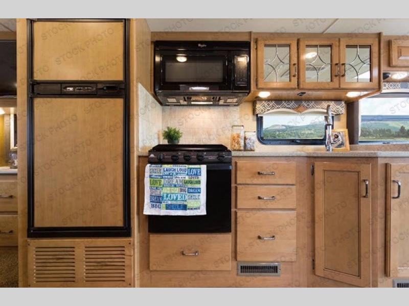 Continuing in the slide out, the kitchen includes a refrigerator, three burner range, overhead microwave, corner angled kitchen sink, counter space, and overhead cabinets for your dishes and things. A sofa bed completes the slide.