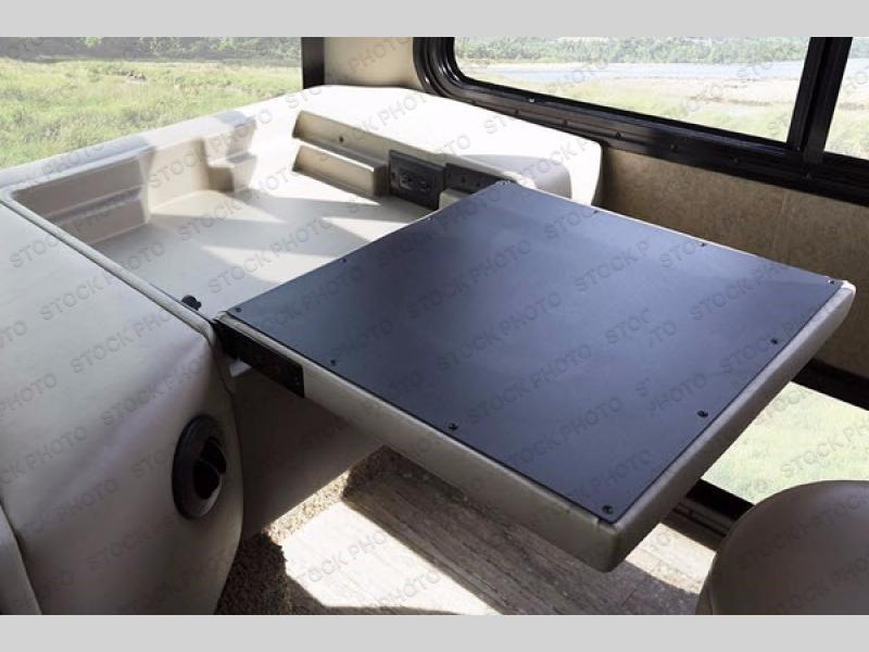 At the front you may choose to use the drop down overhead bunk that provides a 54" x 74" sleeping area, or the coffee table below in between the captain's chairs for your morning cup of Joe.