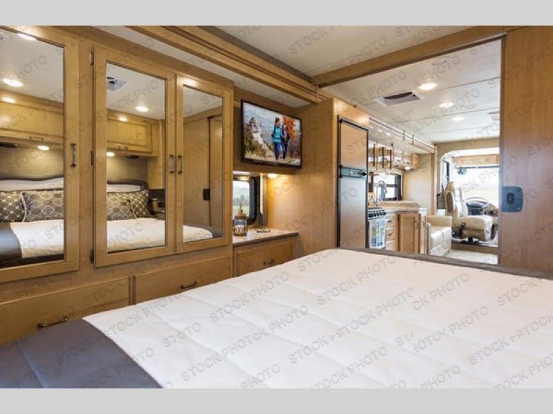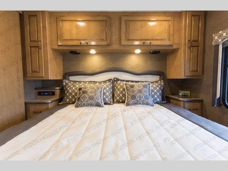 The rear private bedroom includes a king size bed with nightstands on each side along with overhead cabinets. The wall opposite the bed is part of a full wall slide out and offers a wardrobe, dresser, and a 32" LED TV.