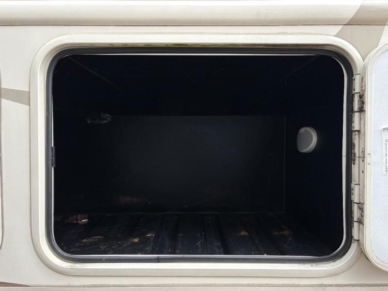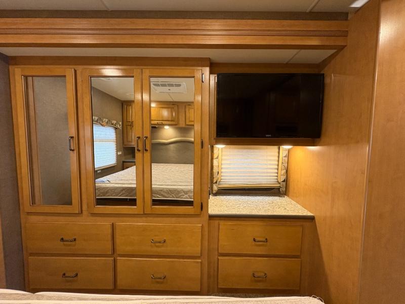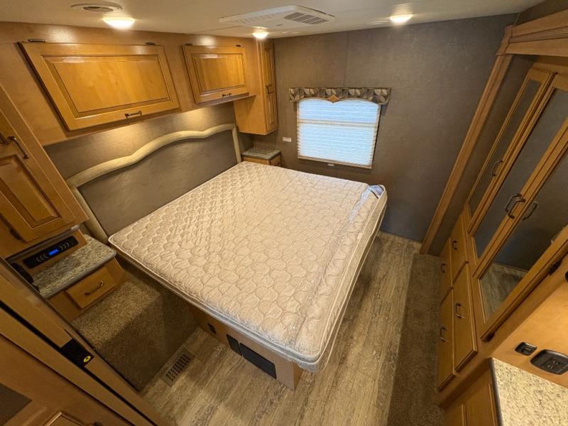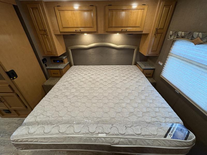 A rear bedroom provides a king size bed with nightstands on each side and overhead cabinets the width of the bedroom. The wall opposite the bed is part of the full wall slide and offers a wardrobe and a dresser plus a 32" LED TV.