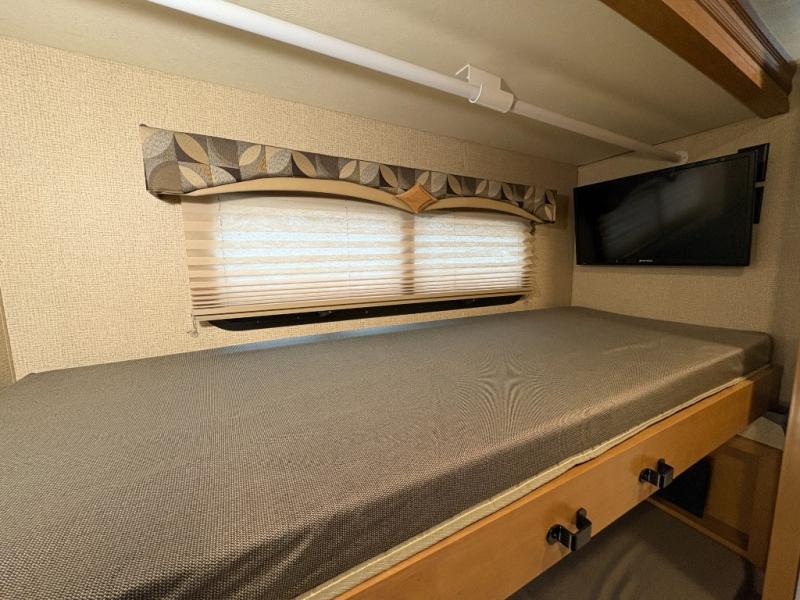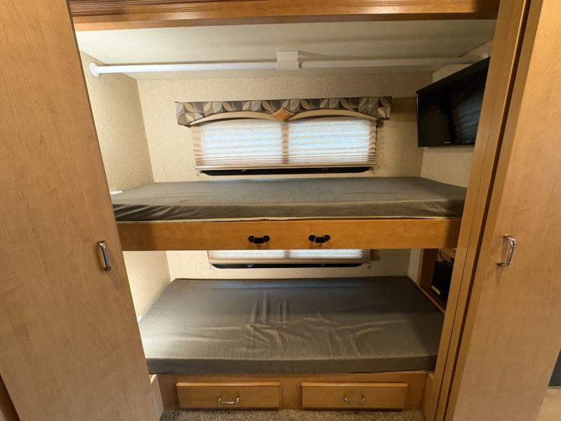 Outside the bedroom, the slide out continues with the bunk beds for the kids or grandkids. Moving forward, a three burner range, overhead microwave, corner angled kitchen sink, counter space, overhead cabinets and a dream booth dinette complete the full wall slide. A 40" LED TV is mounted above the dinette.