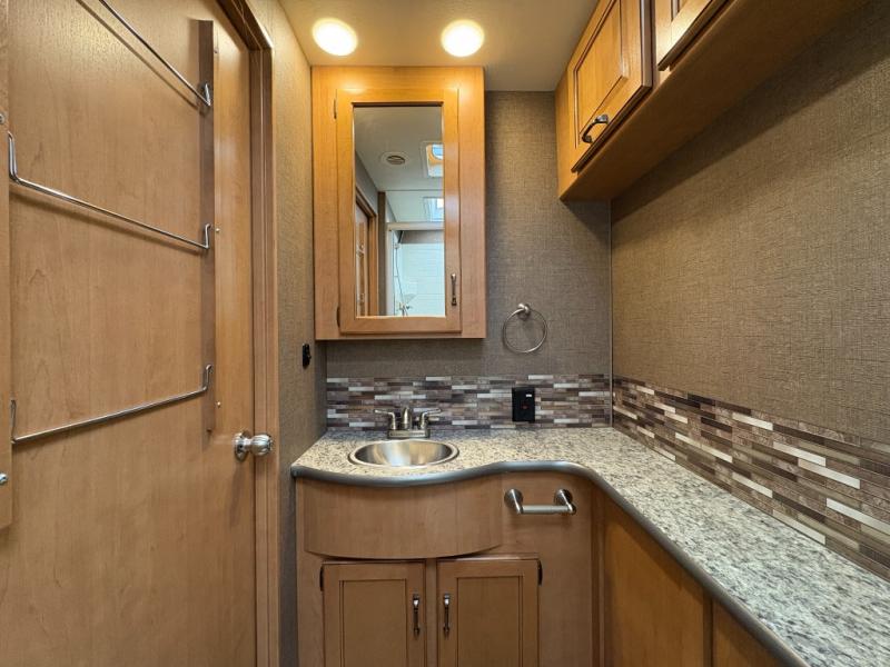 A side aisle bath along the curbside wall and across from the bunks provides a shower, toilet, generous vanity with sink, overhead storage, and a medicine cabinet.