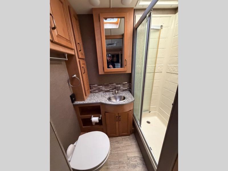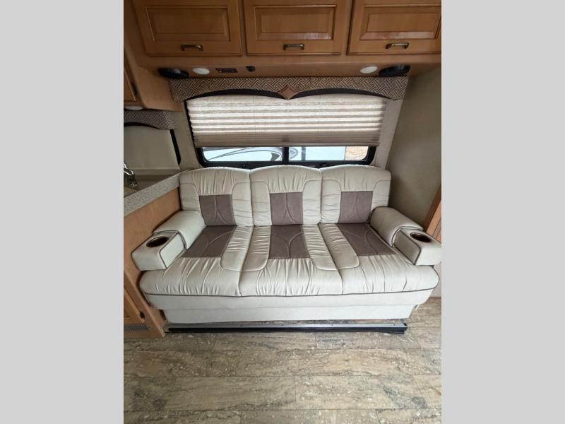 At the front you may choose to use the drop down overhead bunk that provides a 54" x 74" sleeping area, or the coffee table below in between the captain's chairs for your morning cup of Joe.