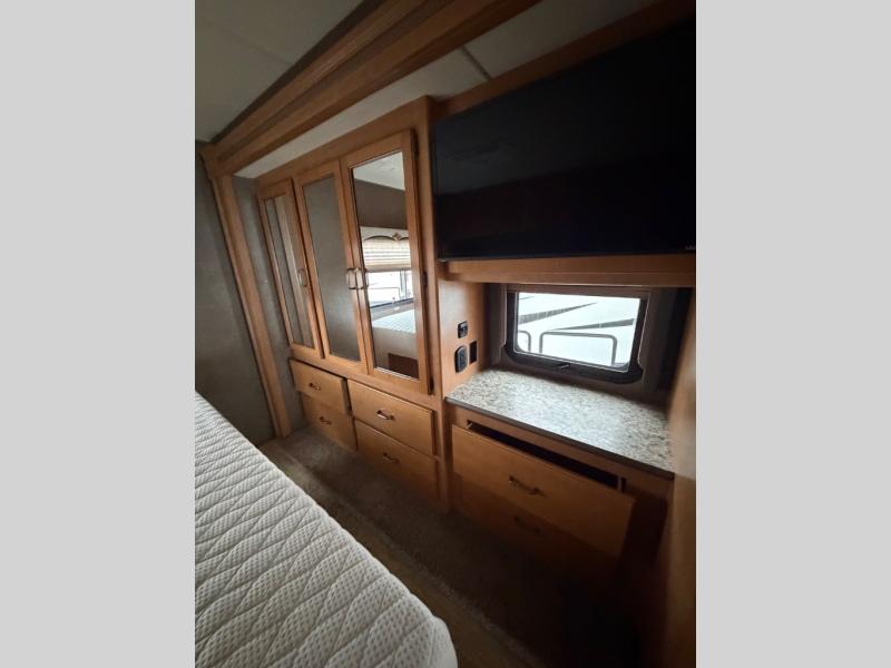 The rear private bedroom includes a king size bed with nightstands on each side along with overhead cabinets. The wall opposite the bed is part of a full wall slide out and offers a wardrobe, dresser, and a 32" LED TV.