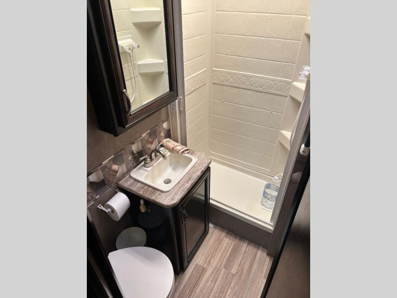 The rear right corner features a queen bed slide out with nightstands and overhead storage .and a 32" LED TV . There is a privacy curtain to pull closed at night. And, conveniently located next door find a bathroom with a 24" x 36" shower, toilet, and sink. There is also a closet right outside the door for clothing, towels, or toiletries, plus so much more!