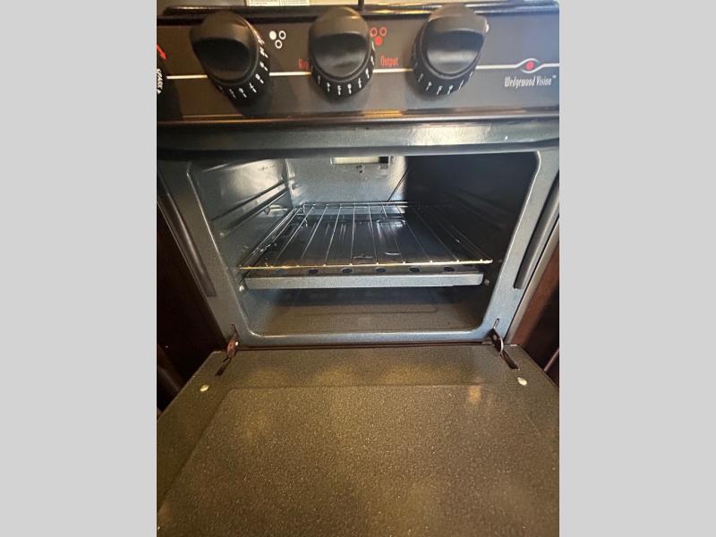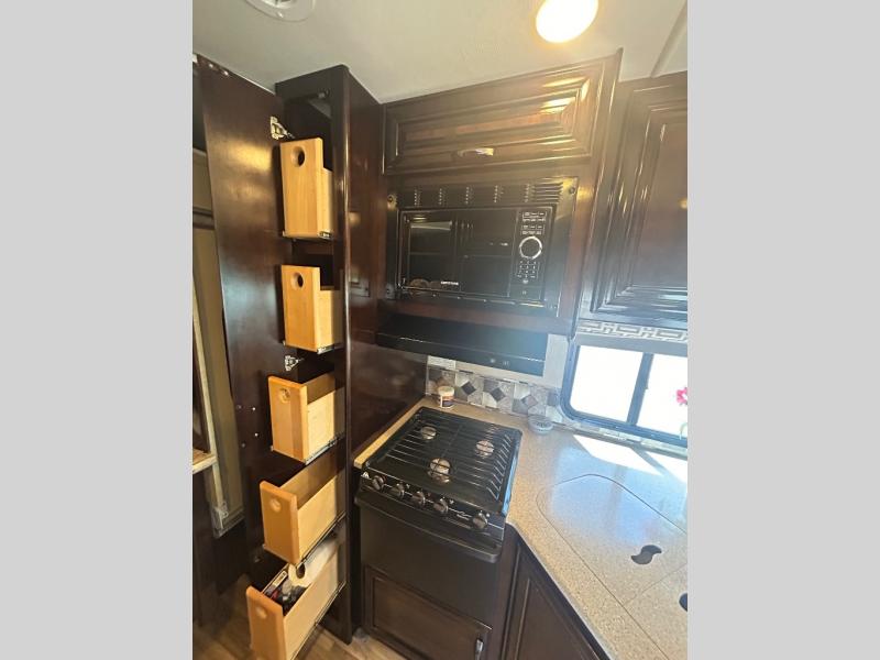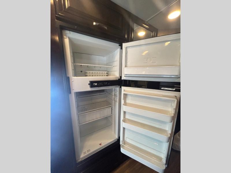 To the left of the entry door find a refrigerator for your perishables. Opposite you can cook and prepare food with a three burner range, an overhead microwave oven, and there is also a double sink for cleaning up. You will also find plenty of storage for your dry and canned good in the pull-out pantry. The upper cabinets also provide places to keep your dishes and things organized and neatly tucked away.
