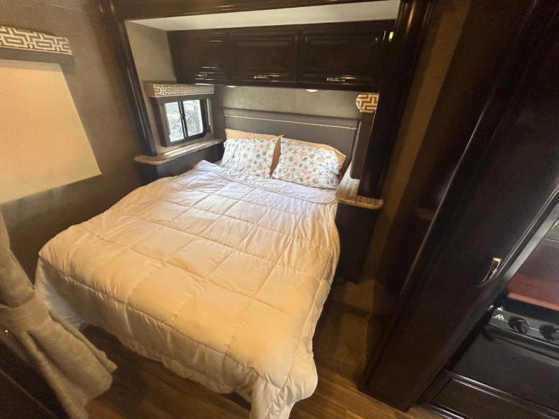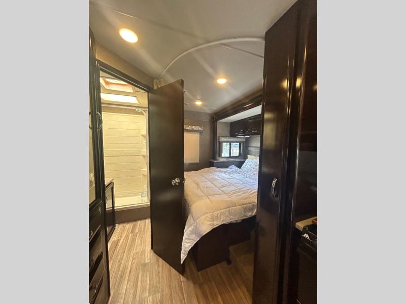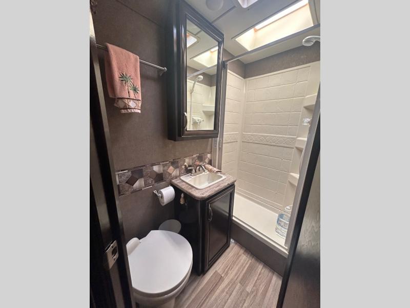 The cab-over bunk will be a favorite of the kids to sleep up top with 54" x 96" of sleeping space. There is also a 40" LED TV on a swivel base for perfect viewing from anywhere in the coach. The built-in skylight allows extra natural light inside.