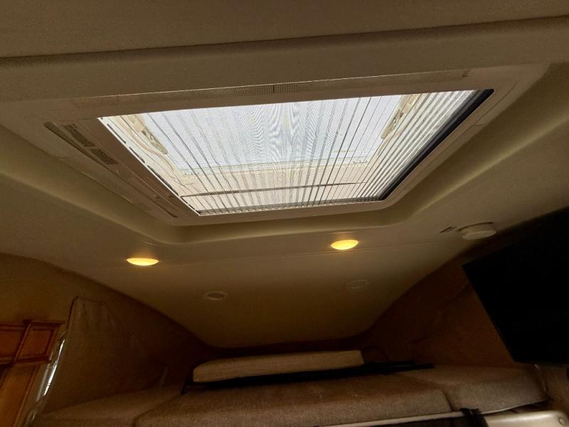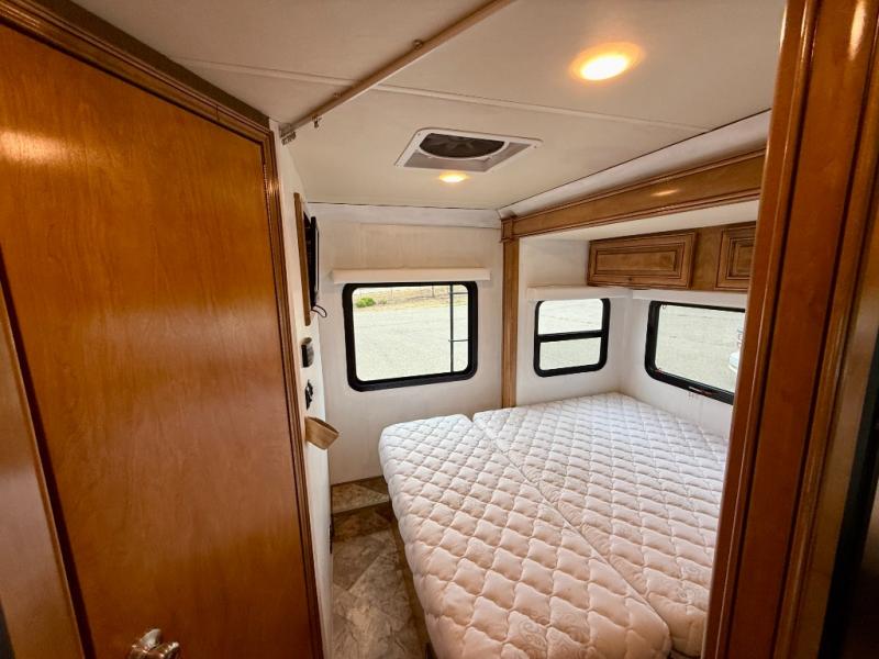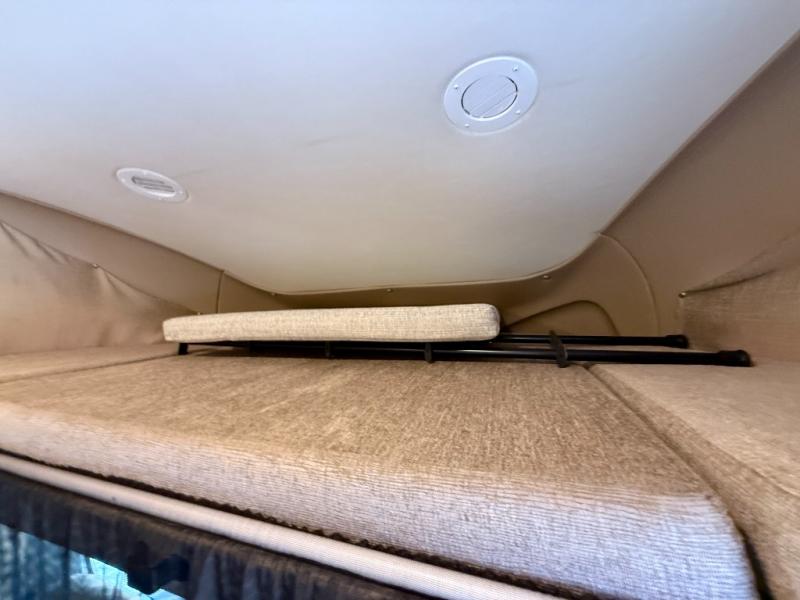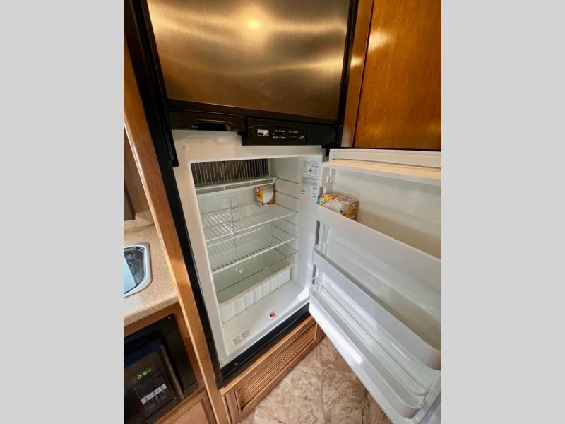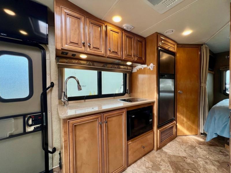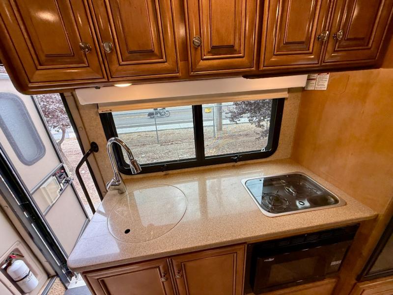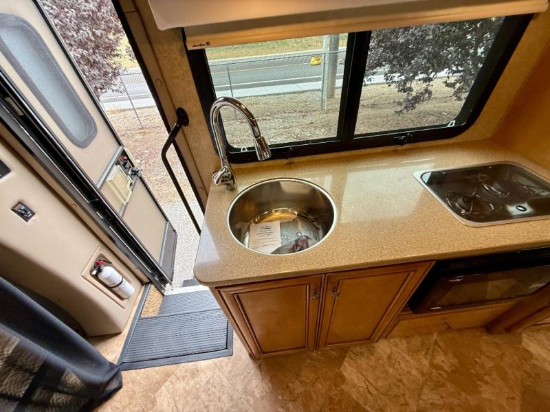 Model 24SS offers double slides, a rear corner bath, and cab-over bunk for an added 36" x 75" sleeping space. Enter just behind the front passenger seat and notice the 32" LED TV overhead. To your immediate left there is a kitchenette that will allow you to easily make meals and snacks on the road. There is a round single sink, some counter space, and a two burner range top, plus overhead microwave oven. There is also a refrigerator for your perishables.