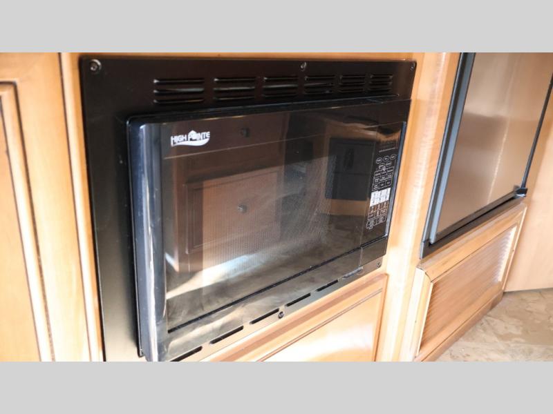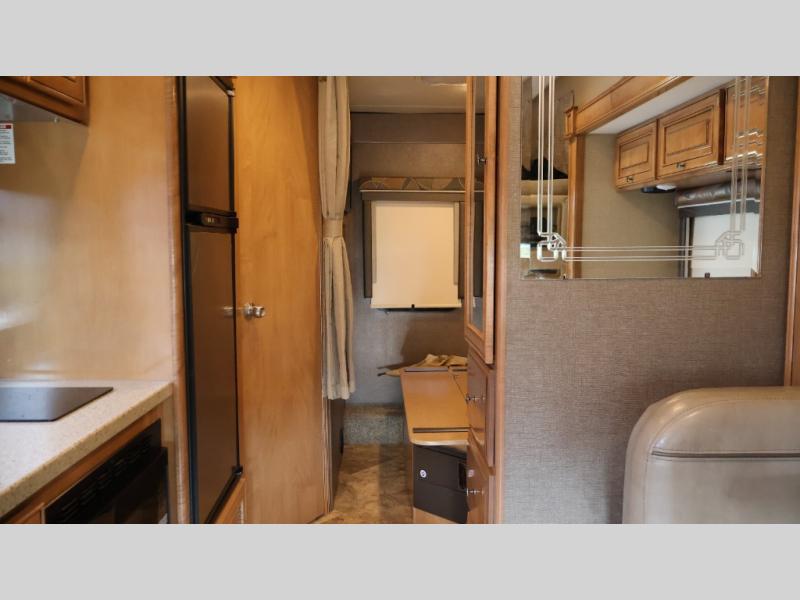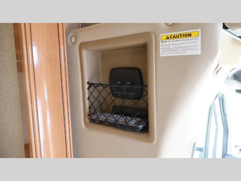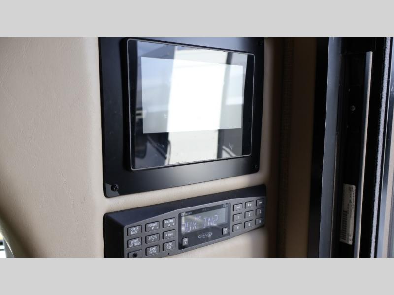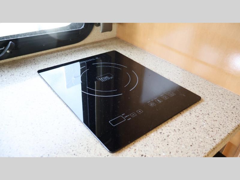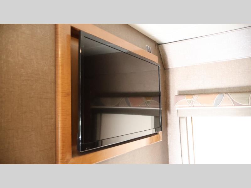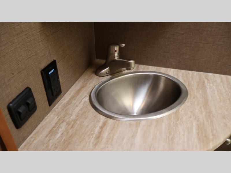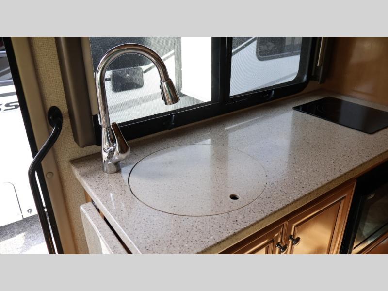 Model 24SS offers double slides, a rear corner bath, and cab-over bunk for an added 36" x 75" sleeping space. Enter just behind the front passenger seat and notice the 32" LED TV overhead. To your immediate left there is a kitchenette that will allow you to easily make meals and snacks on the road. There is a round single sink, some counter space, and a two burner range top, plus overhead microwave oven. There is also a refrigerator for your perishables.
