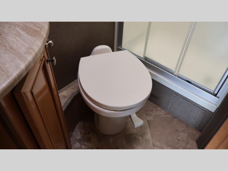 A rear corner bath features a 24" x 32" shower, toilet, and vanity with sink, plus overhead medicine cabinet. The opposite corner features a queen size bed slide out on the road side plus a nightstand and more overhead cabinets. There is a 32" LED TV, and more.