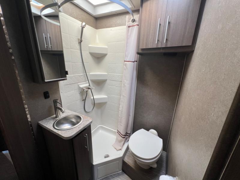 Moving toward the rear of the coach you have a complete bath with corner 27" x 27" shower, a toilet, and a sink. The bath door can be opened further than normal with its bi-fold hinge and positioned when open to block off a larger space for more privacy when dressing.