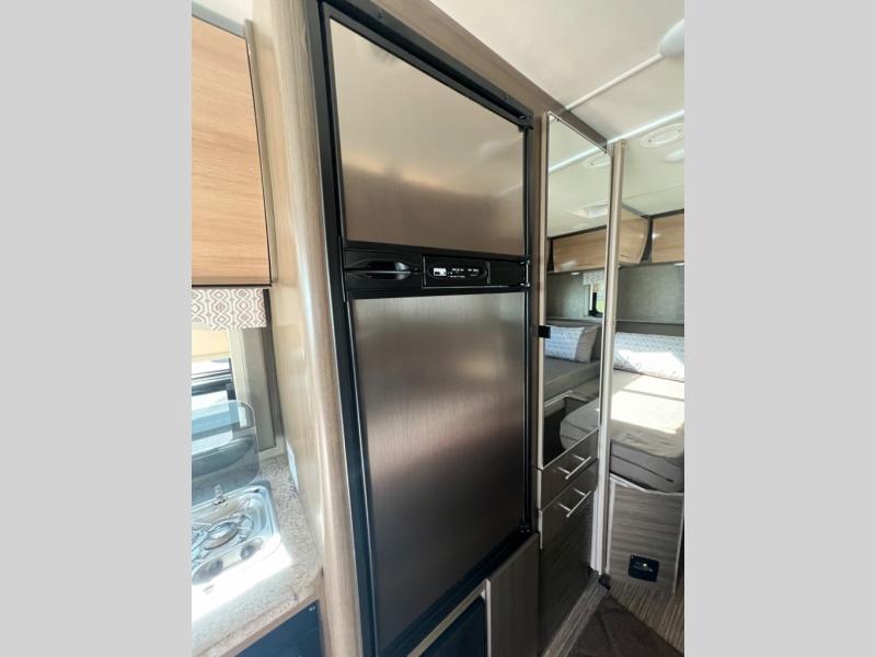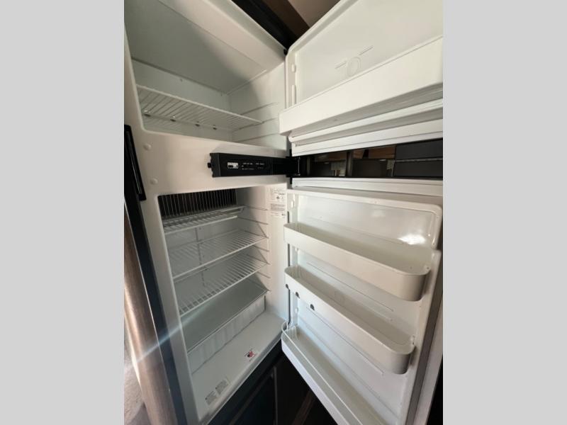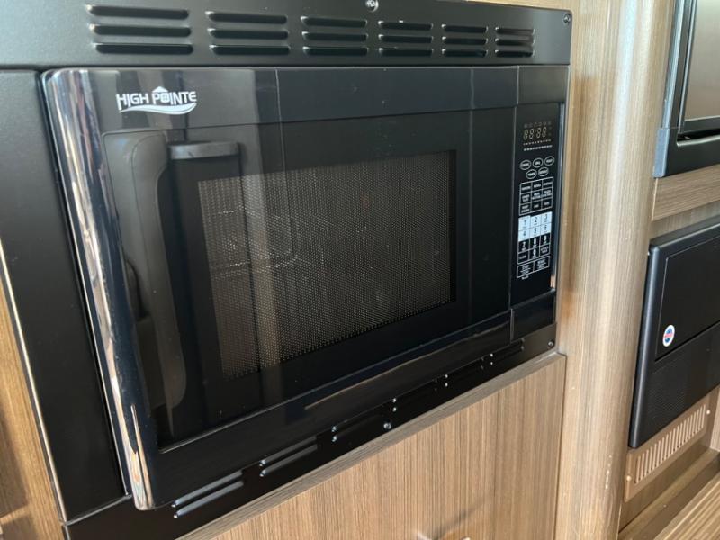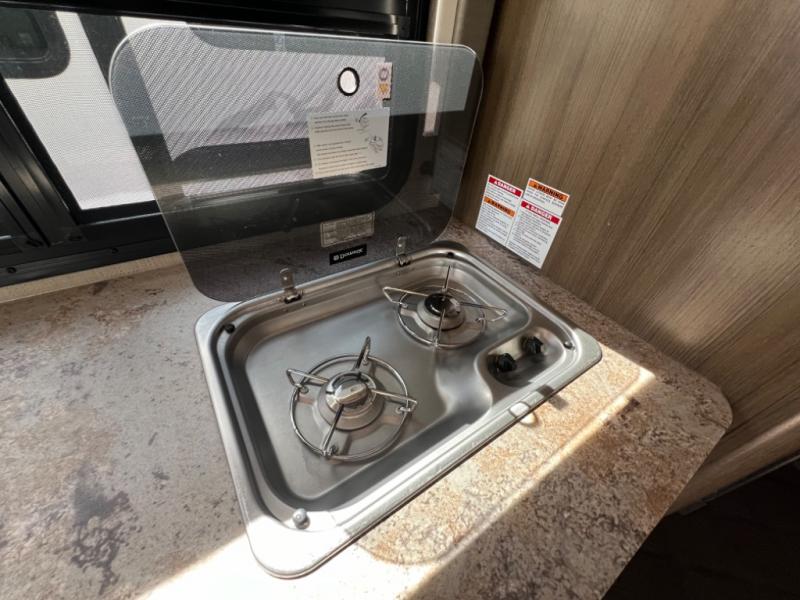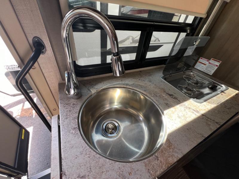 As you enter the side door there is a 32" LED TV directly above your head. To your immediate left is a round kitchen sink, flip-up counter-top, and three burner range with microwave oven above. You will also find a refrigerator for all of your perishables, plus overhead cabinets for dishes and things.