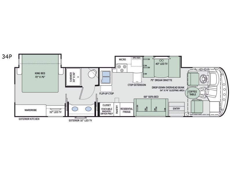 Above the cab area you will find a drop down overhead bunk that sleeps two with a 54" x 74" area which makes this unit easily sleep seven!