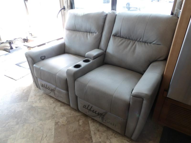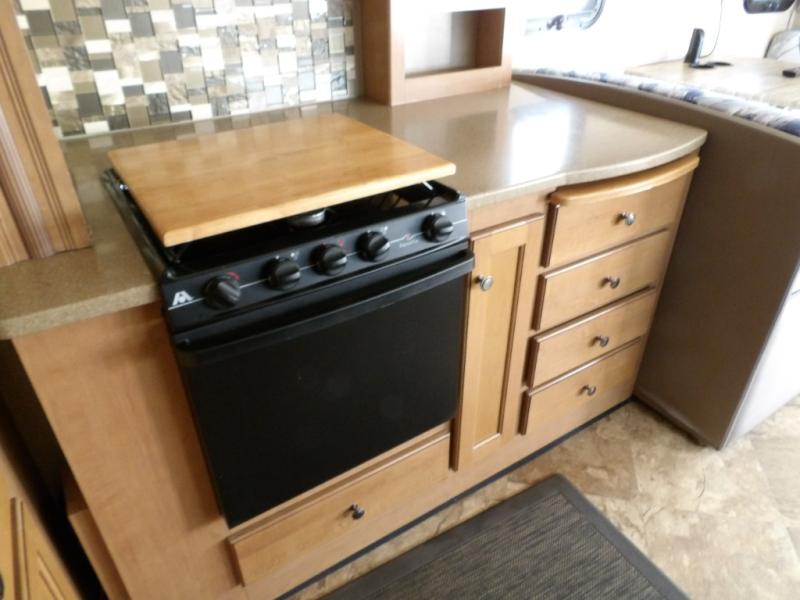 To your immediate left you will find a sofa. Opposite within a slide out there is more seating and sleeping space at the dream dinette. When dining or relaxing you can enjoy the 40" LED TV above the dinette, and this slide also features a counter-top extension, plus a three burner range with overhead microwave oven. Just off the slide there is a double sink, and additional counter space that flips up.