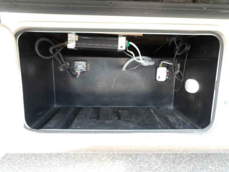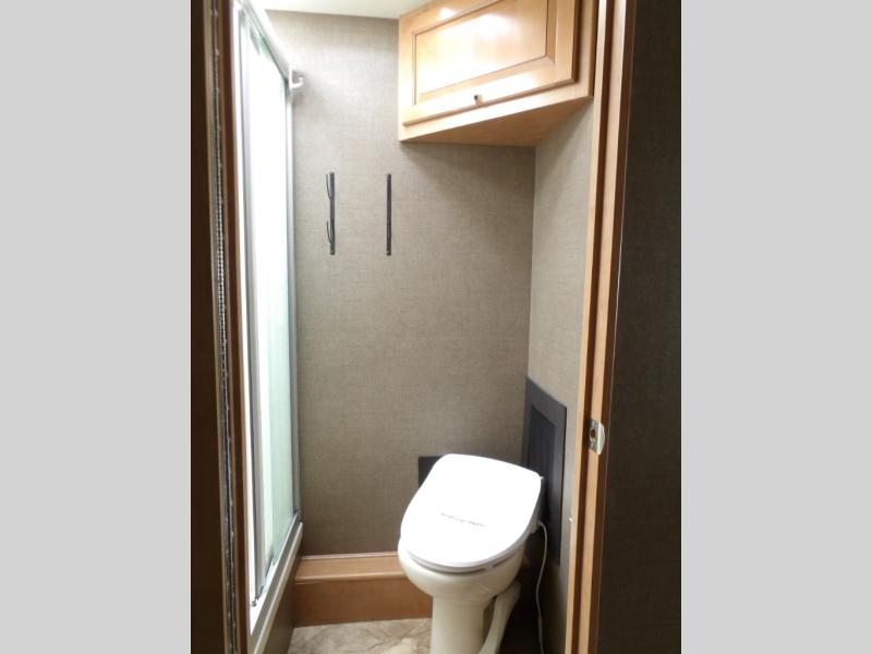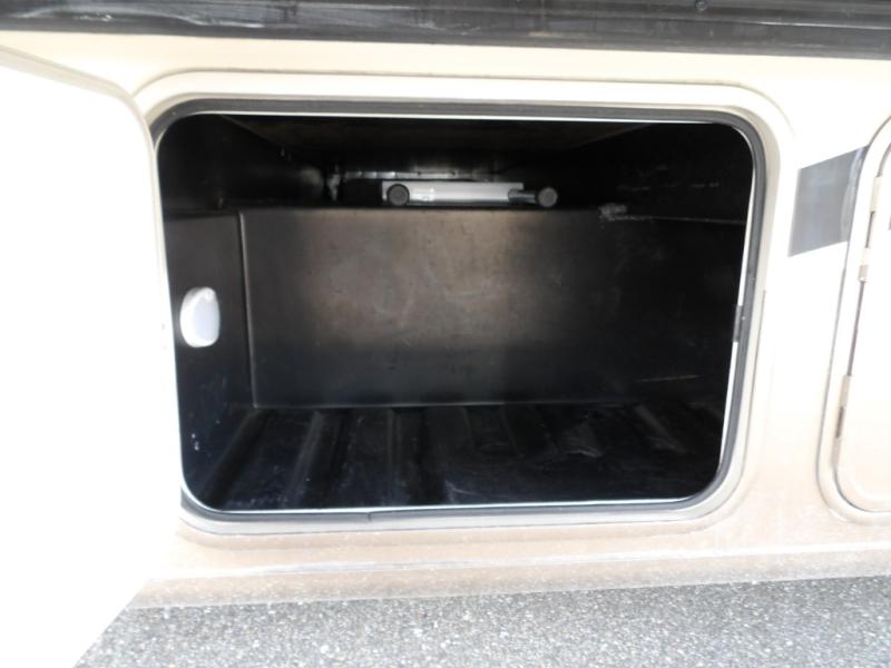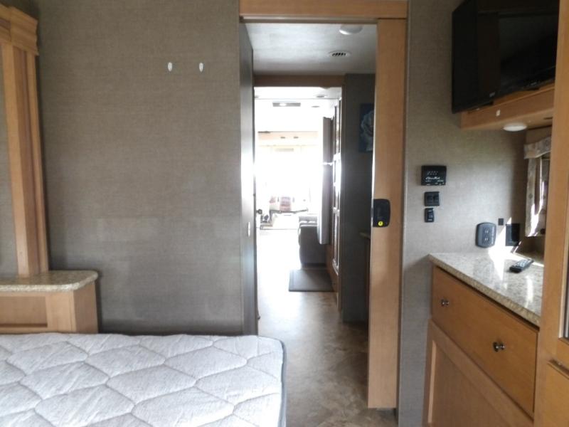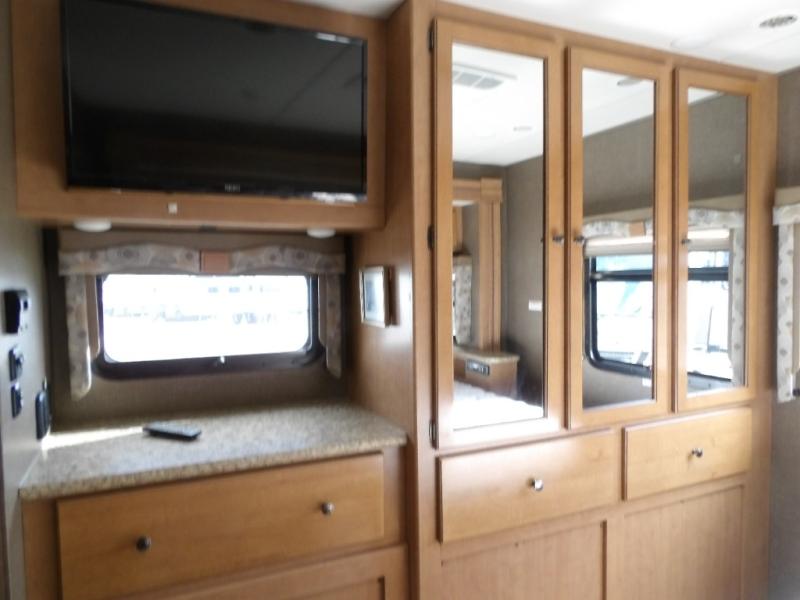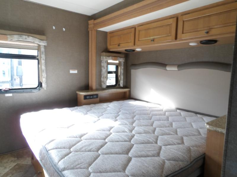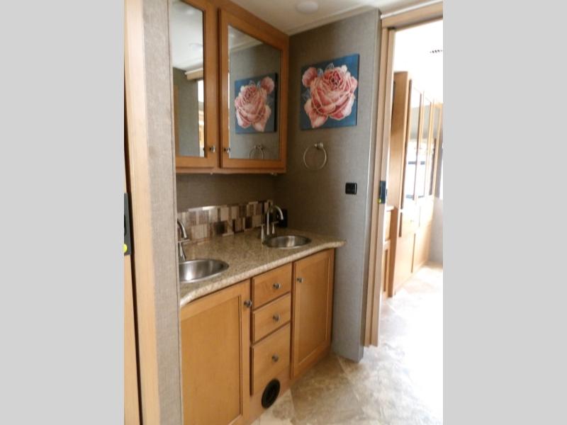 A sliding pocket door then leads you back into the master bedroom beyond a walk-through bath. There are DUAL sinks on your left, and a private 30" x 36" shower and toilet along the road side. Inside the master bedroom you will find a king size bed slide out, and a large wardrobe along with a 32" LED TV opposite.