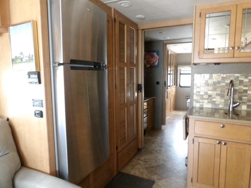 Next to the sofa bed just inside the door is where you will find a residential refrigerator, a pantry that slides out, and a closet with stackable washer/dryer option as the closet has been prepped for both.