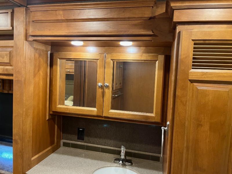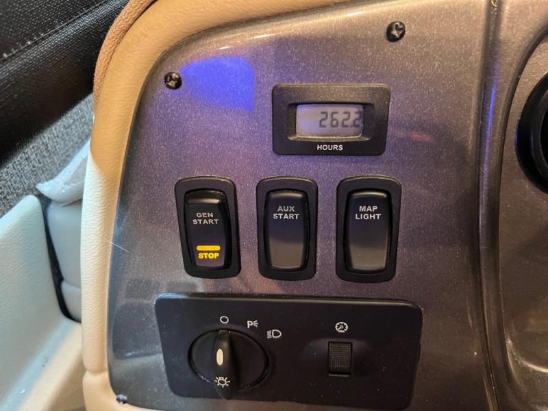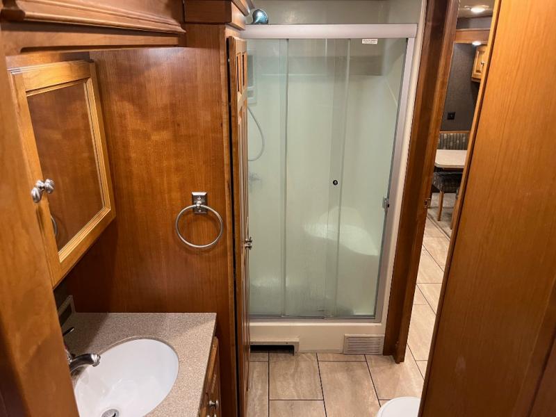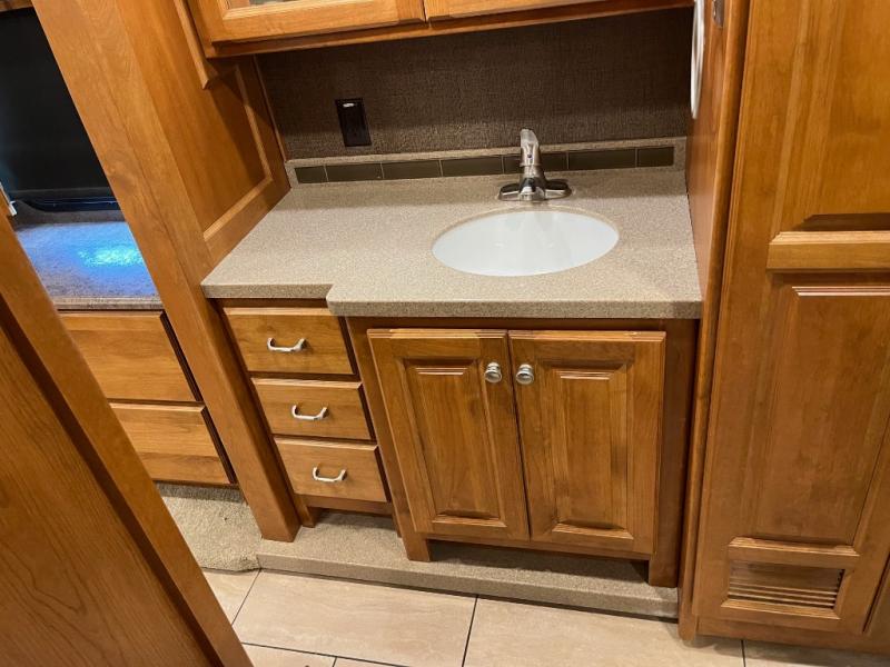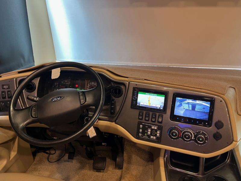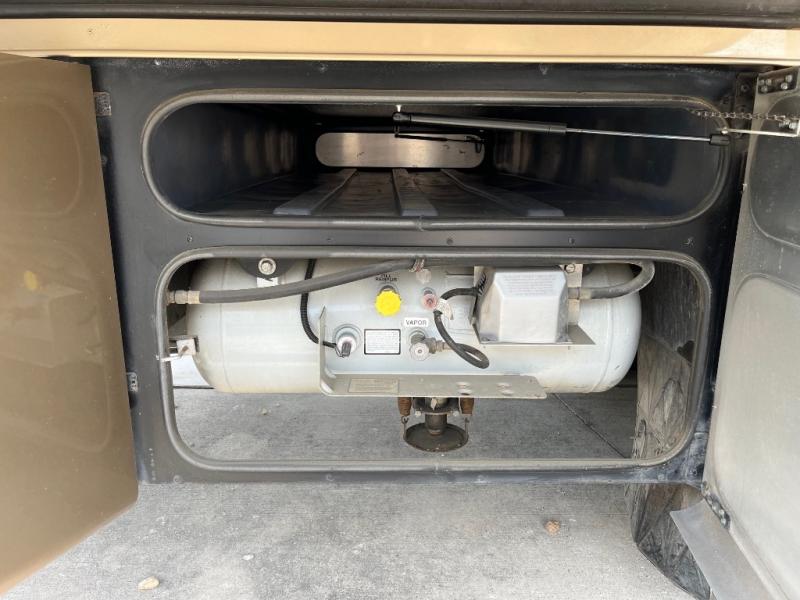 As you enter this motor home, you will find that there are two slide outs in the main living area. The first slide out has a booth dinette, three burner range, microwave, double kitchen sink, overhead cabinet for dishes, and a refrigerator. In place of the booth dinette you can choose to have an optional dinette with computer work station. The slide opposite has a sofa bed or you can choose an optional L-shaped chaise sofa bed with coffee table. Adjacent to the slide you will find a TV, and in the cab there are comfortable seats, overhead storage on either side, and a TV.