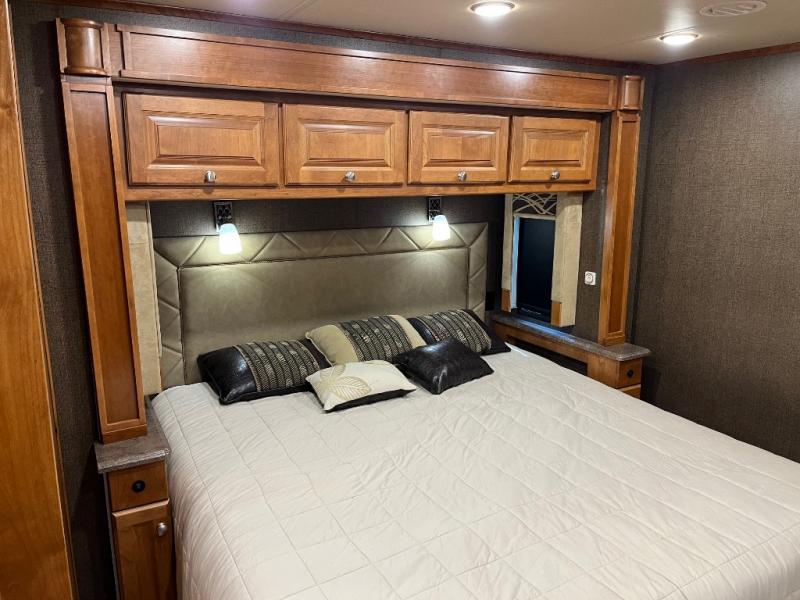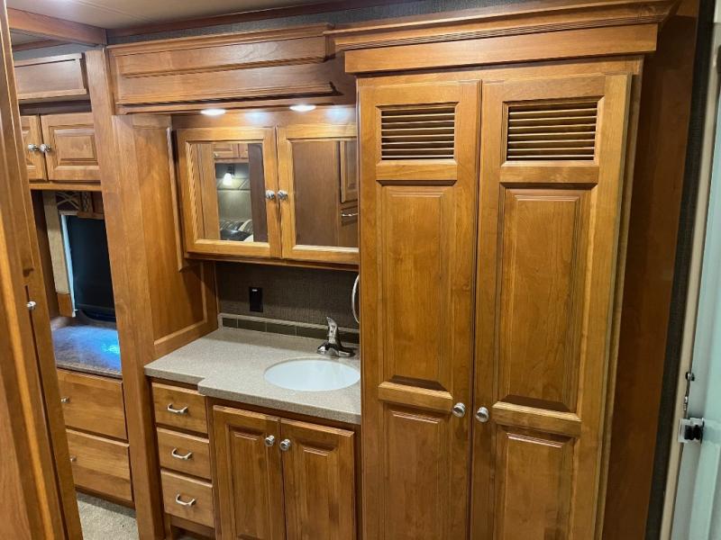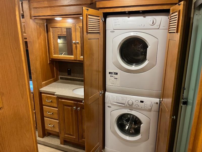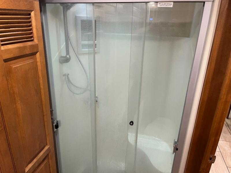 Enter into the rear bedroom and find a slide out with a queen bed or optional king, nightstands, and an overhead cabinet along one side. Along the rear wall of the room there is a TV for your enjoyment. Across from the bed there is a slide out with a wardrobe, overhead cabinet with drawers below, and continuing into the bathroom the slide has a sink, and an optional washer/dryer. The bathroom also has a shower, linen cabinet, and toilet. You will find easy access into the bathroom from either the hallway or from the bedroom.